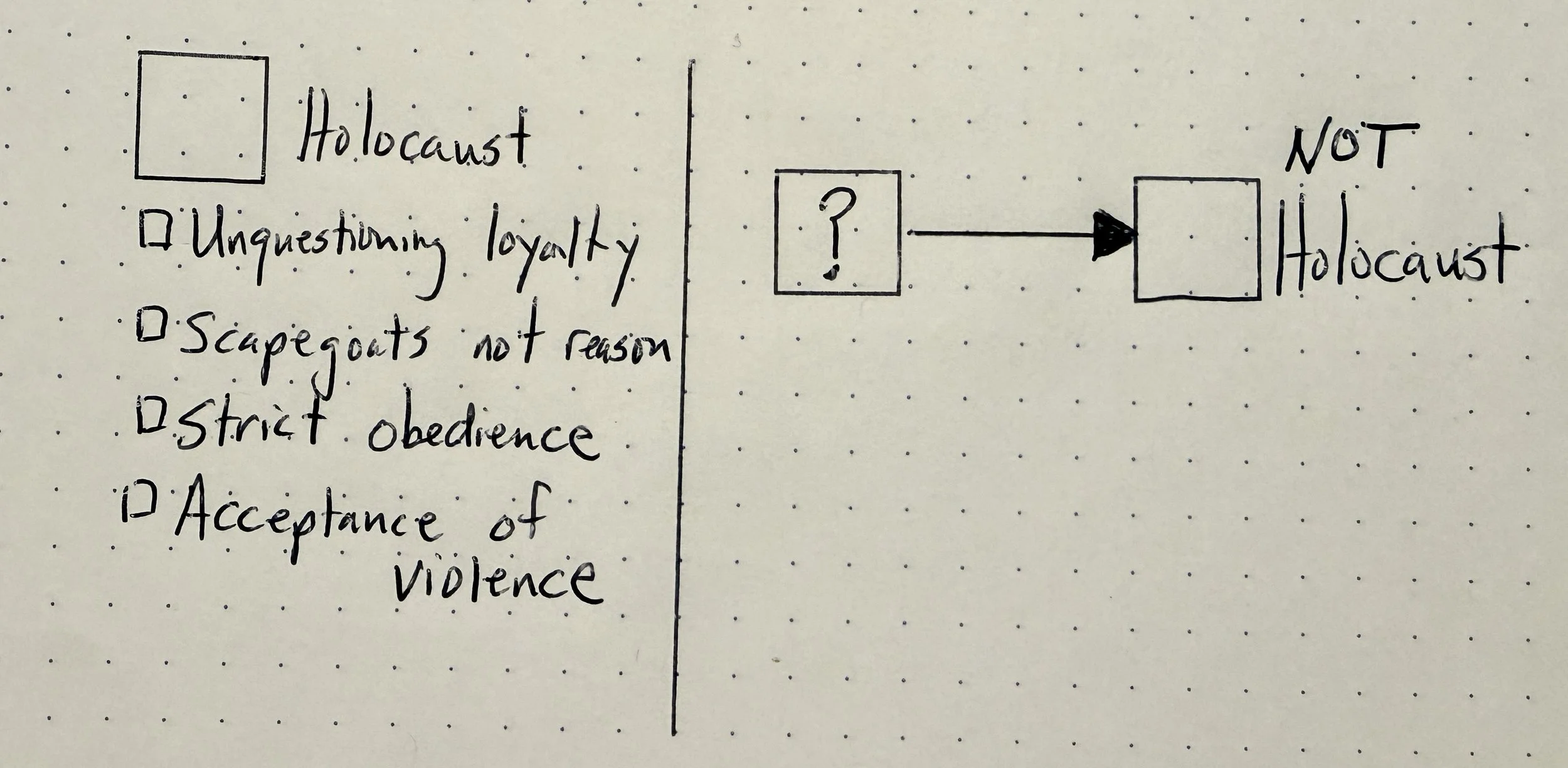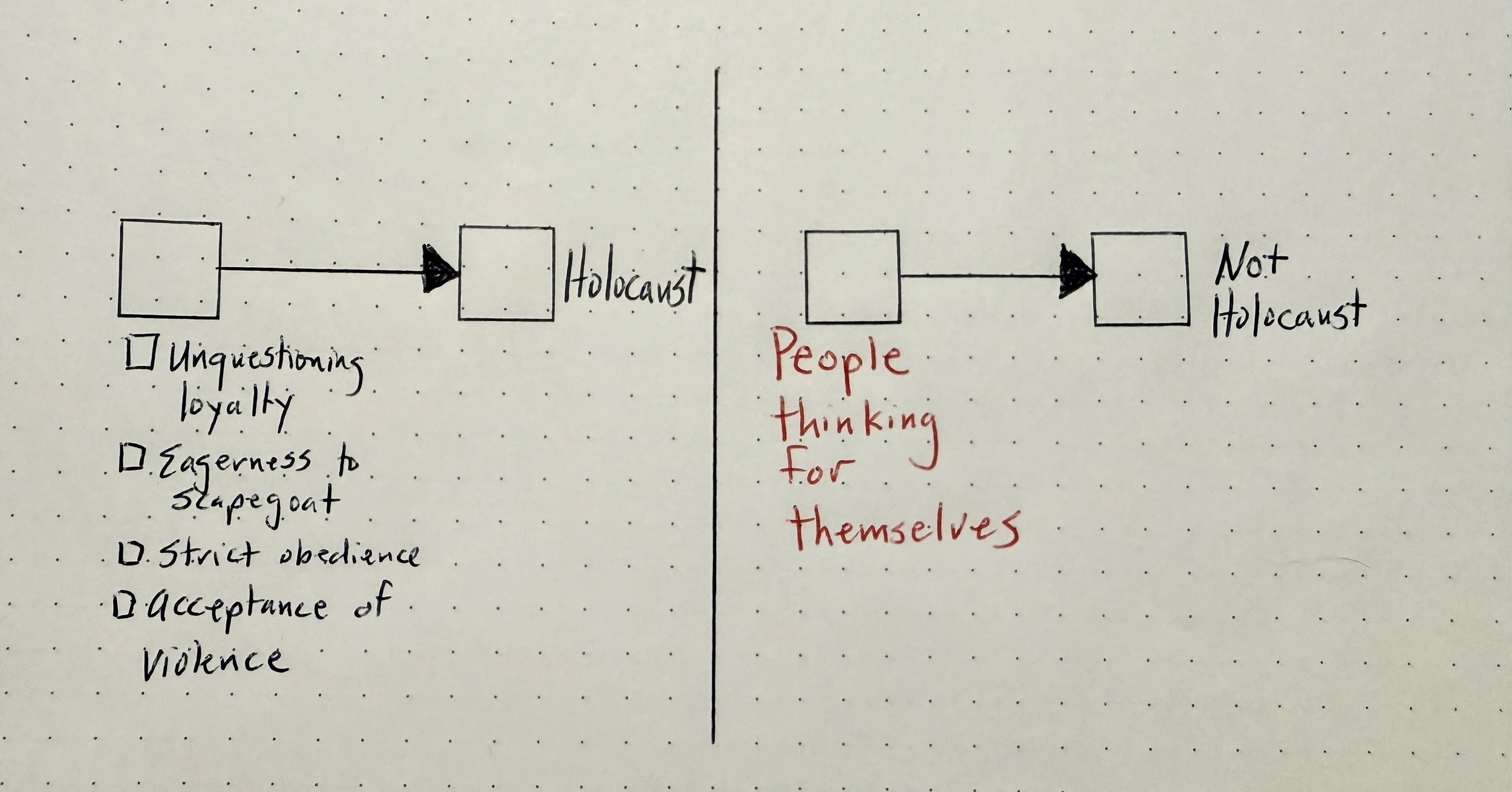 Map 5. Here’s my map of Ian’s mental model. He used the parts from the system discussion as actions for the reaction, Holocaust. This made it easy for him to recognize information that was an anti-cause to Holocaust, or a cause to Not Holocaust. His response struck me to the ground that day. Because he answered so quickly, I suspect he’d already organized this mental model long before I asked the question.