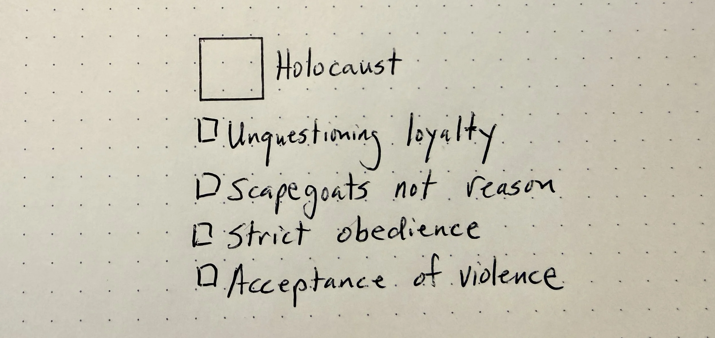 One day we were between activities in my class. During the lull, some students started having an informal discussion, others seemed to be just milling about quietly. During the discussion, students were making connections between the English teacher’s Holocaust unit, and what we were studying in my class. While I listened, a question occurred to me. During a longer pause in the discussion, I asked Ian, one of the students quietly moving around my question. “Ian, what’s one thing that would’ve made the Holocaust not as terrible?”